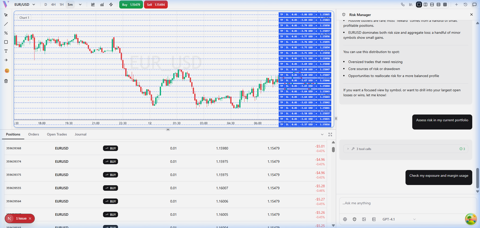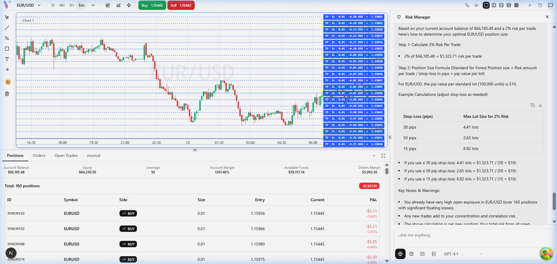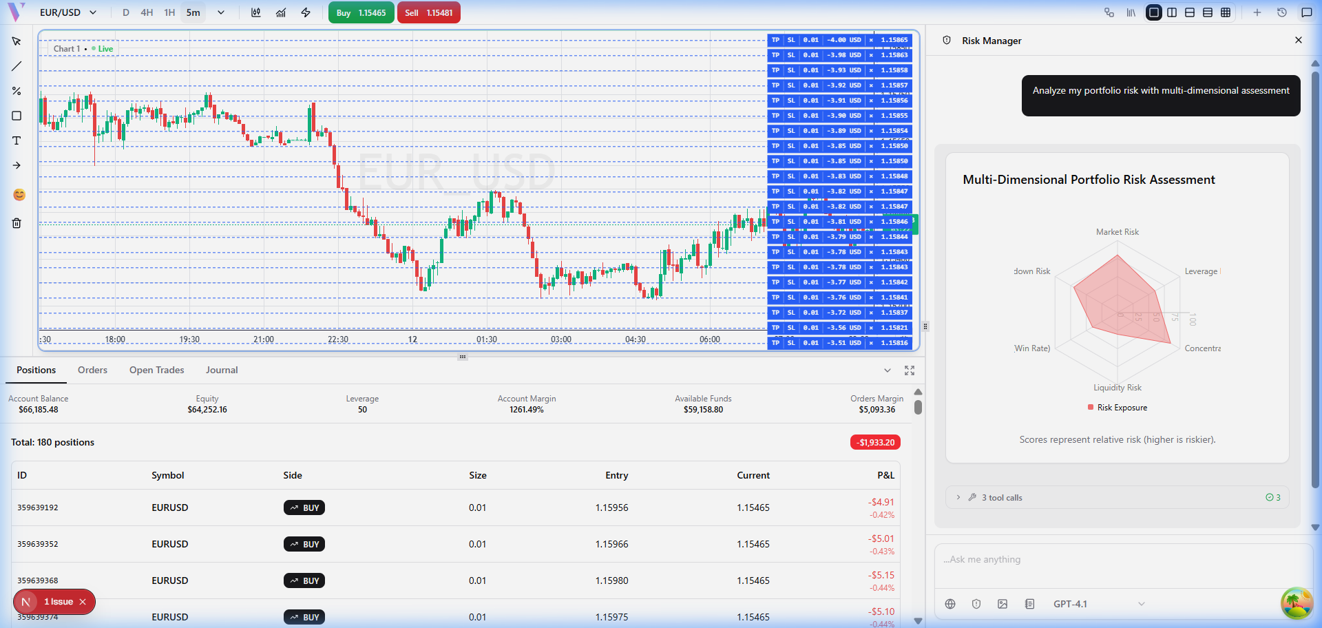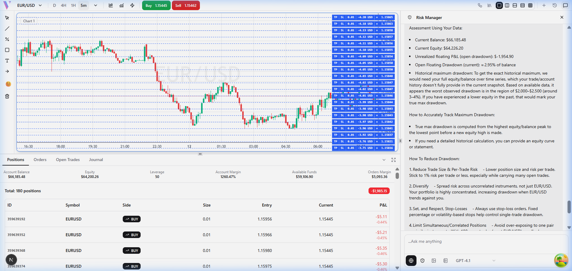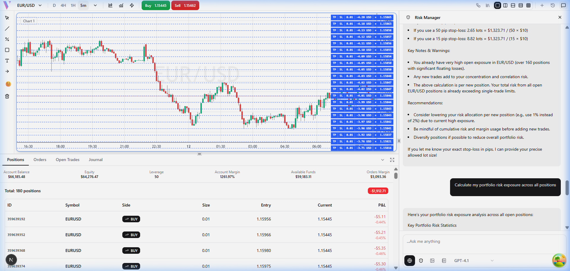 The Risk Manager connects to your live account to evaluate portfolio risk, calculate optimal position sizes, monitor margin usage, and track drawdown β giving you a complete risk picture before every trade.
