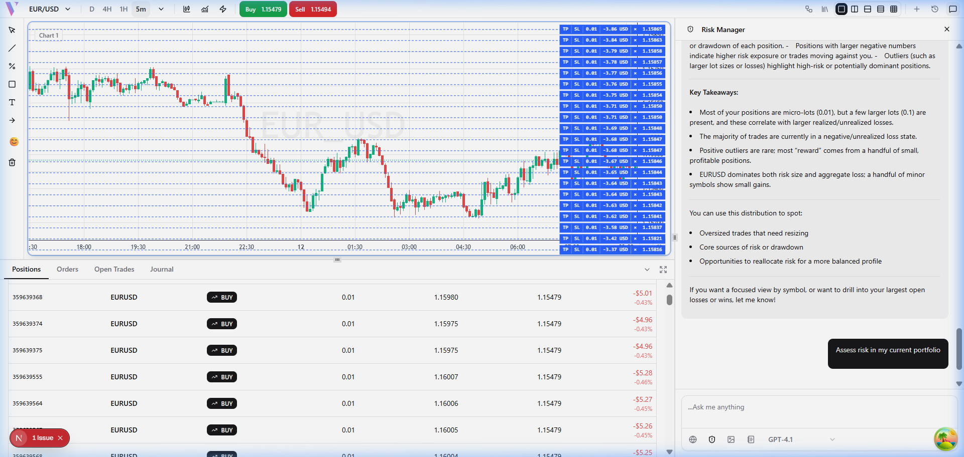 **Prompt:** "Calculate my portfolio risk exposure across all positions" **What You Get:** A complete exposure breakdown by currency, direction, and correlation.