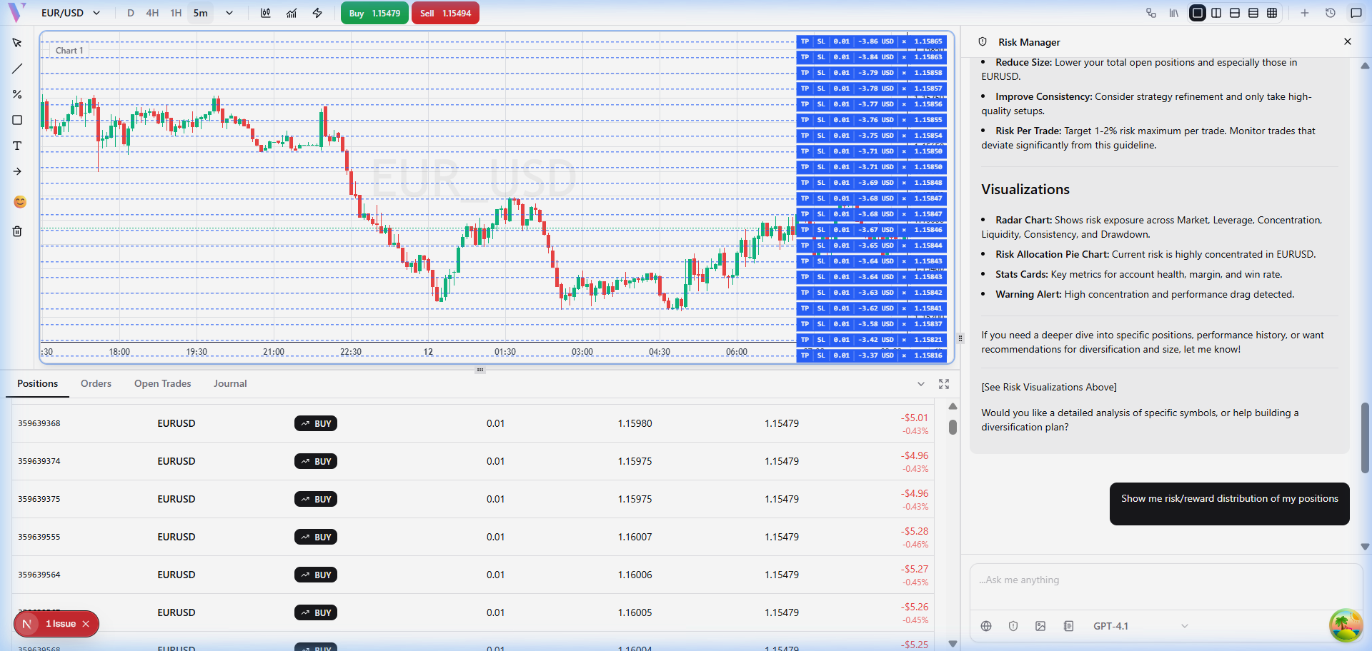 **Prompt:** "Show me risk/reward distribution of my positions" **What You Get:** Visual distribution of R:R ratios across all open trades.