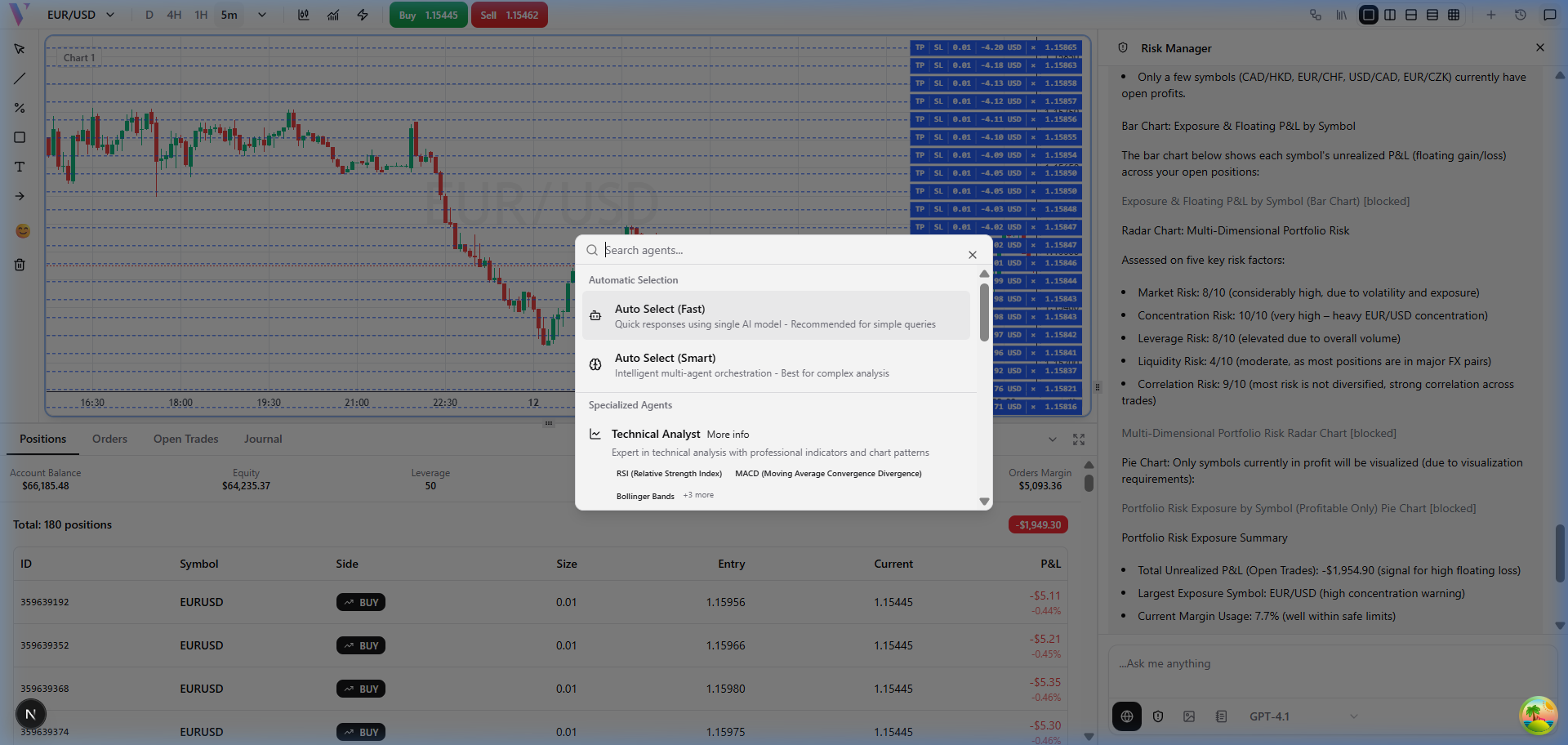 Click the **Brain icon** in the bottom-right of the chat to open the Agent Selector, then choose **Risk Manager**. This activates the specialist optimized for risk analysis and position sizing.