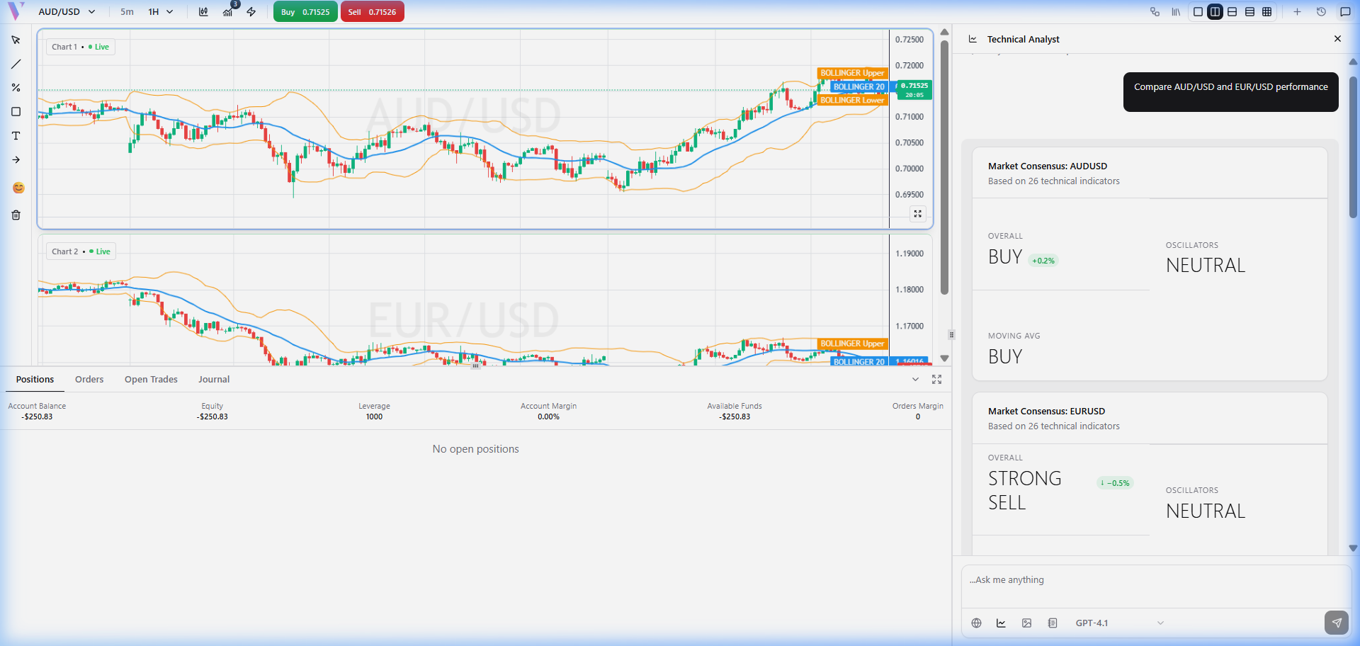 **Prompt:** "Compare AUD/USD and EUR/USD performance" **What You Get:** A relative performance check between two major pairs, showing which is outperforming technically and how their indicator profiles differ.