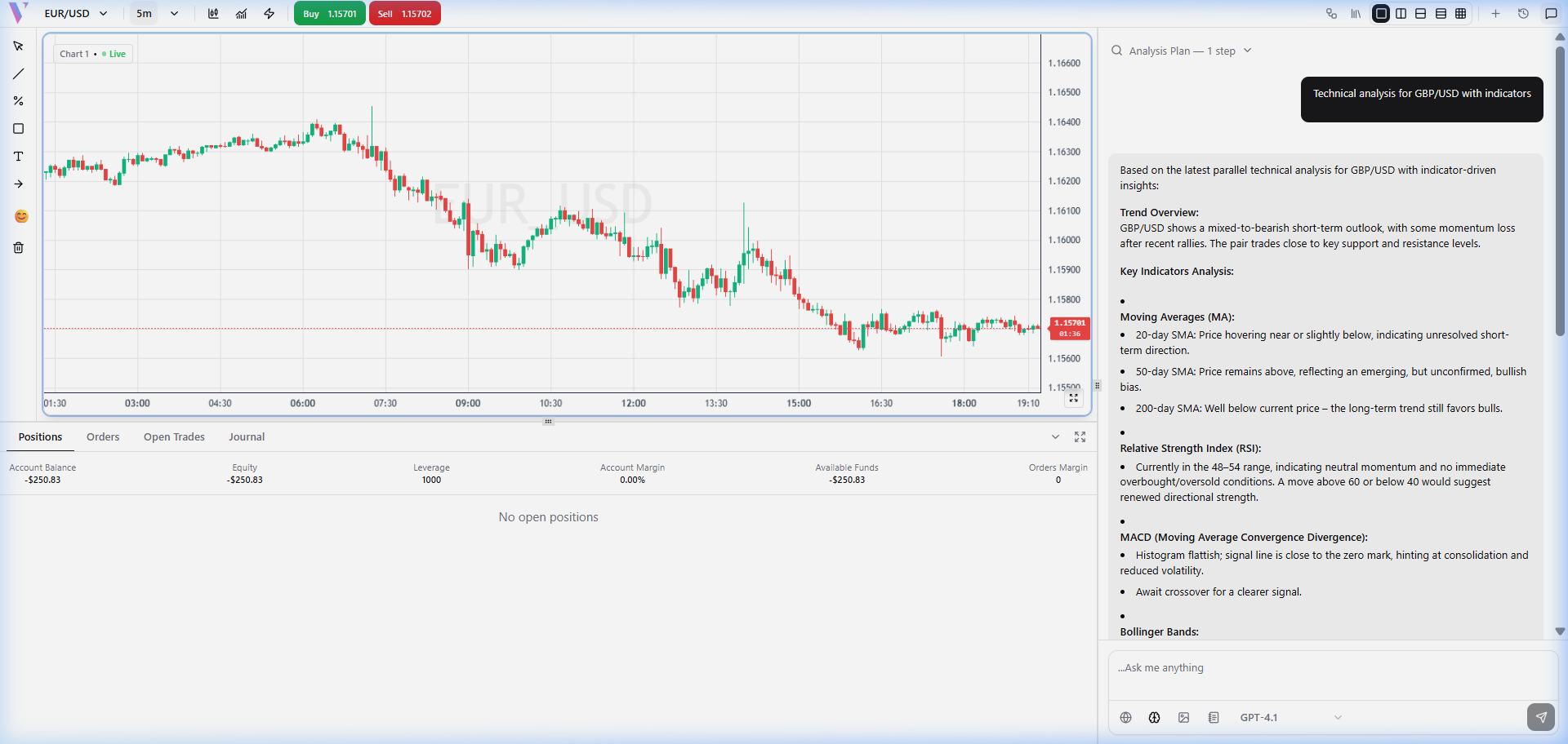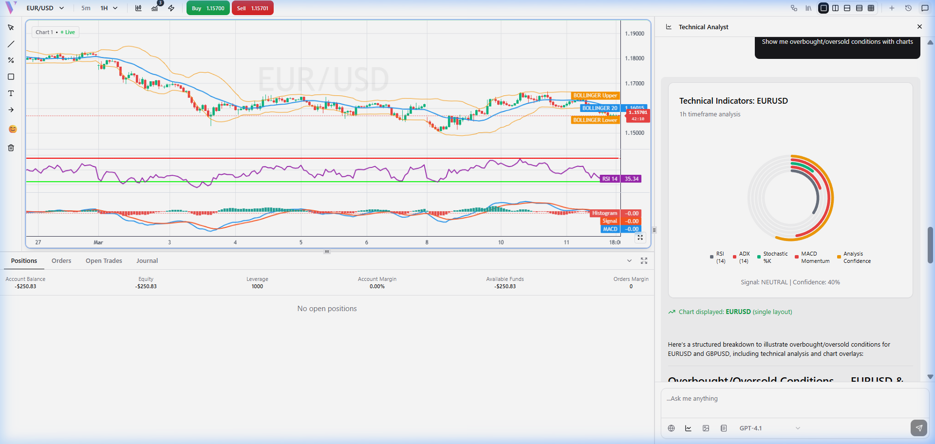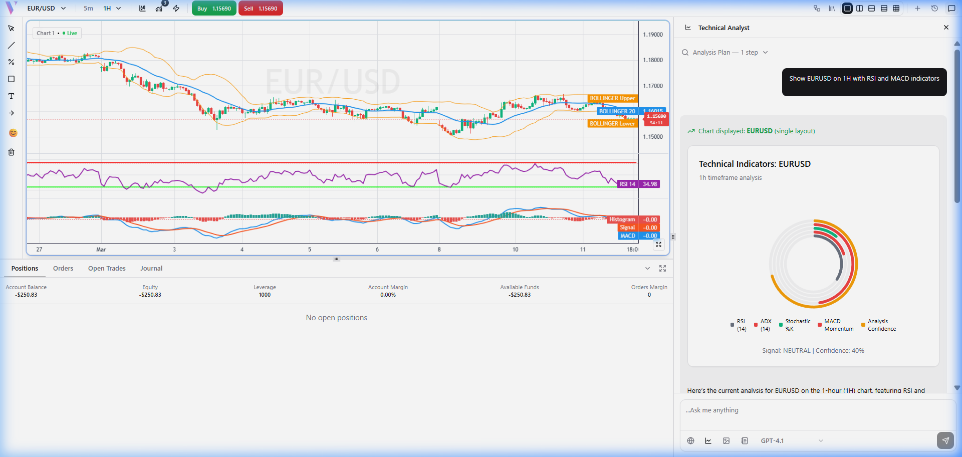 **Prompt:** "Show EURUSD on 1H with RSI and MACD indicators" **What You Get:** The agent automatically switches your chart to the 1-hour timeframe and overlays the RSI and MACD indicators. It also provides a text breakdown of the indicator readings.