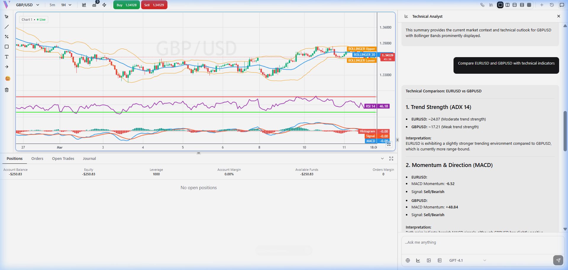 **Prompt:** "Compare EURUSD and GBPUSD with technical indicators" **What You Get:** A side-by-side technical comparison. The agent provides indicator scores for both pairs, helping you identify which market has stronger trend or momentum signals.