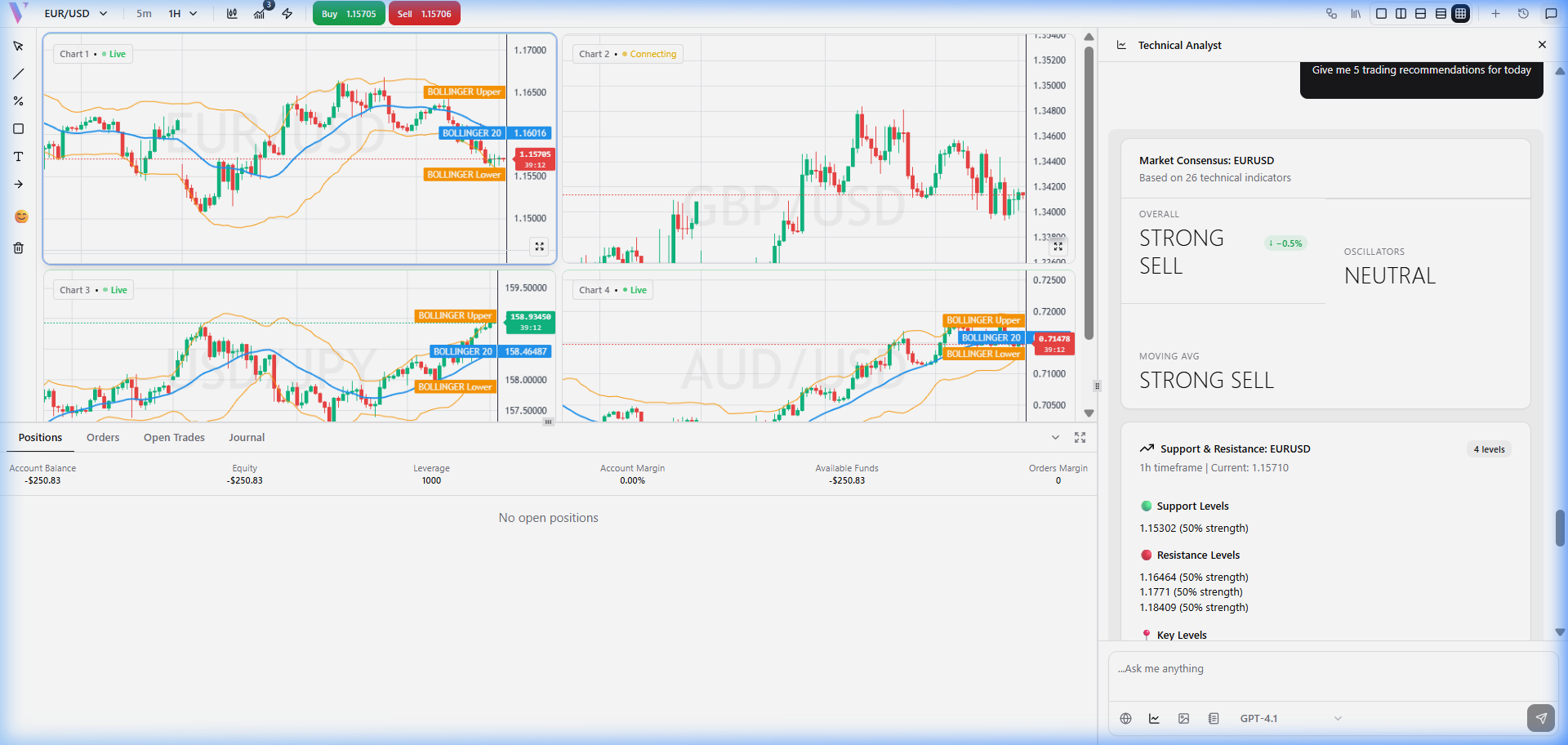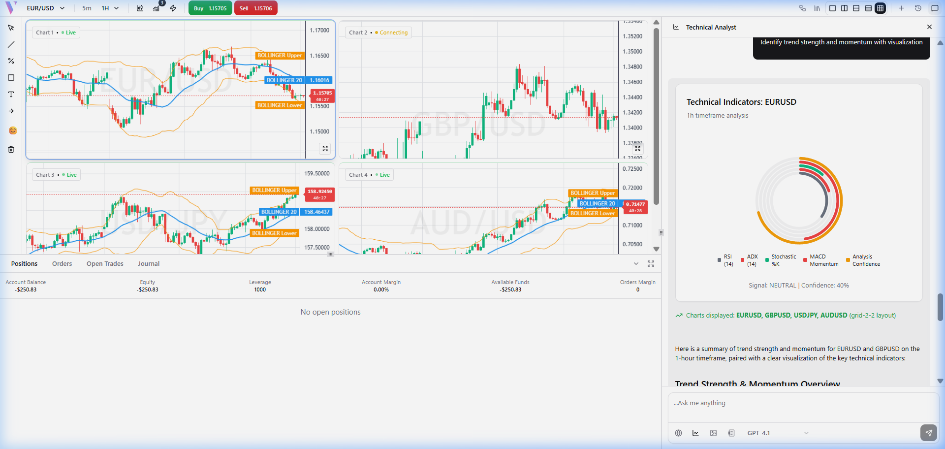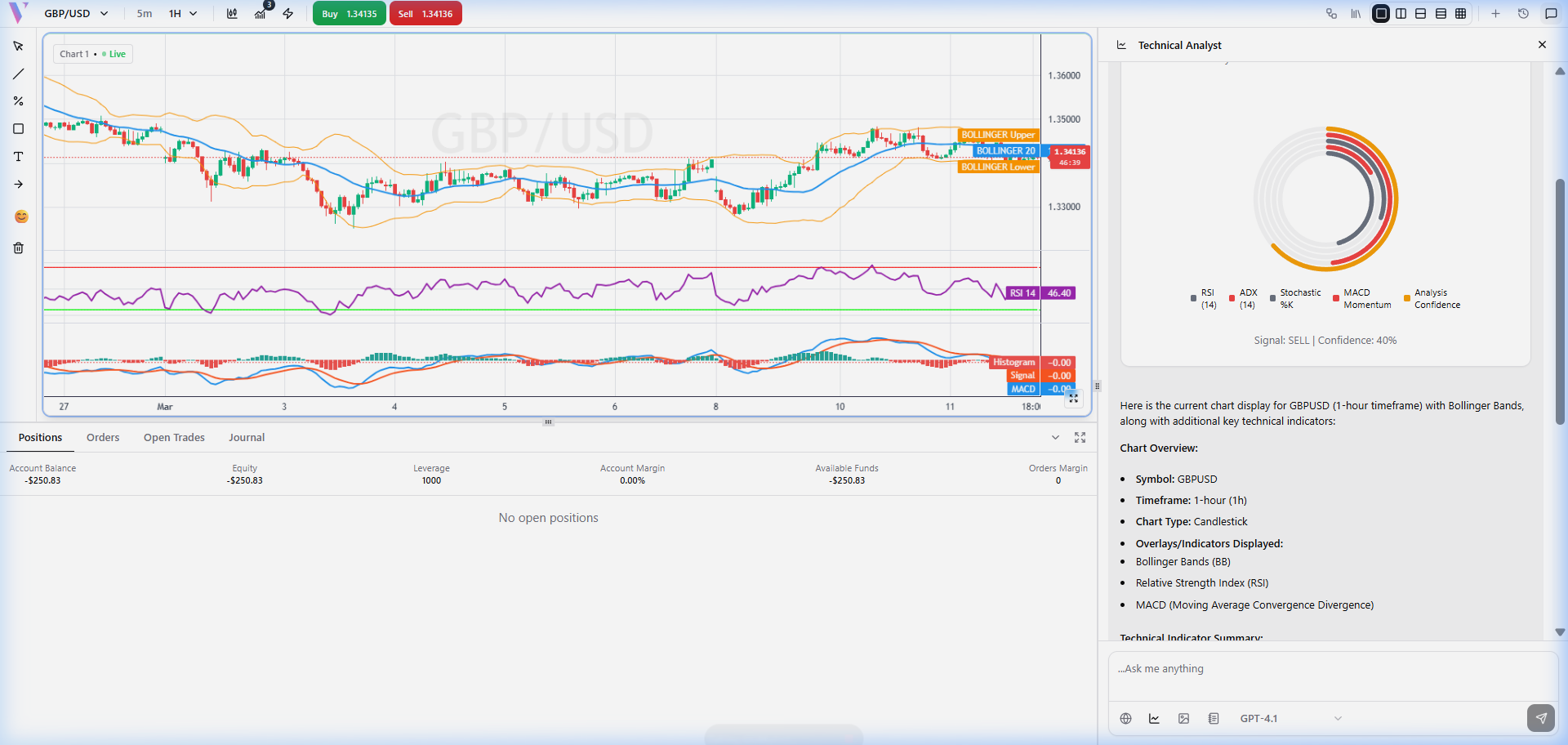 **Prompt:** "Display chart for GBPUSD with Bollinger Bands" **What You Get:** An interactive chart for GBPUSD with Bollinger Bands plotted. The response includes a radial chart showing the consensus signal (Buy/Sell) based on the bands.