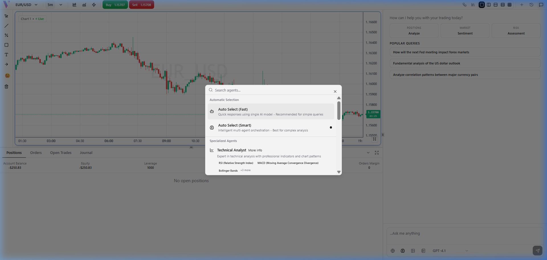 Click the **Brain icon** in the bottom-right of the chat to open the Agent Selector, then choose **Technical Analyst**. This ensures your query is handled by the specialist optimized for indicator analysis and chart plotting.