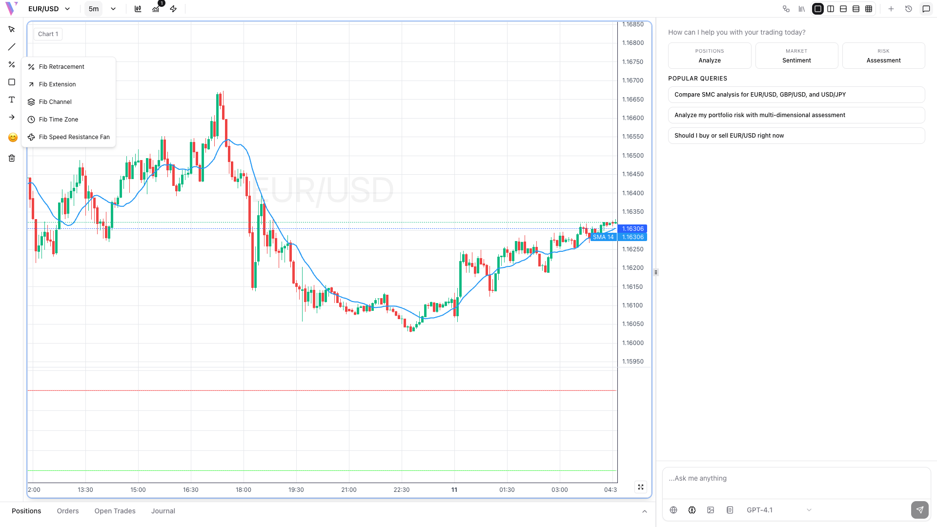Click the Fib Retracement button in the drawing toolbar to access Fibonacci tools including retracements, extensions, and channels.