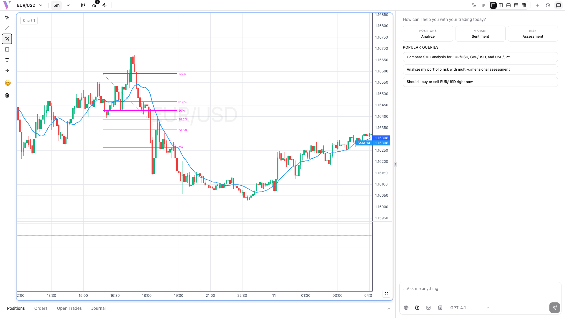 Click and drag from a significant swing low to swing high (uptrend) or high to low (downtrend) to plot Fibonacci levels.