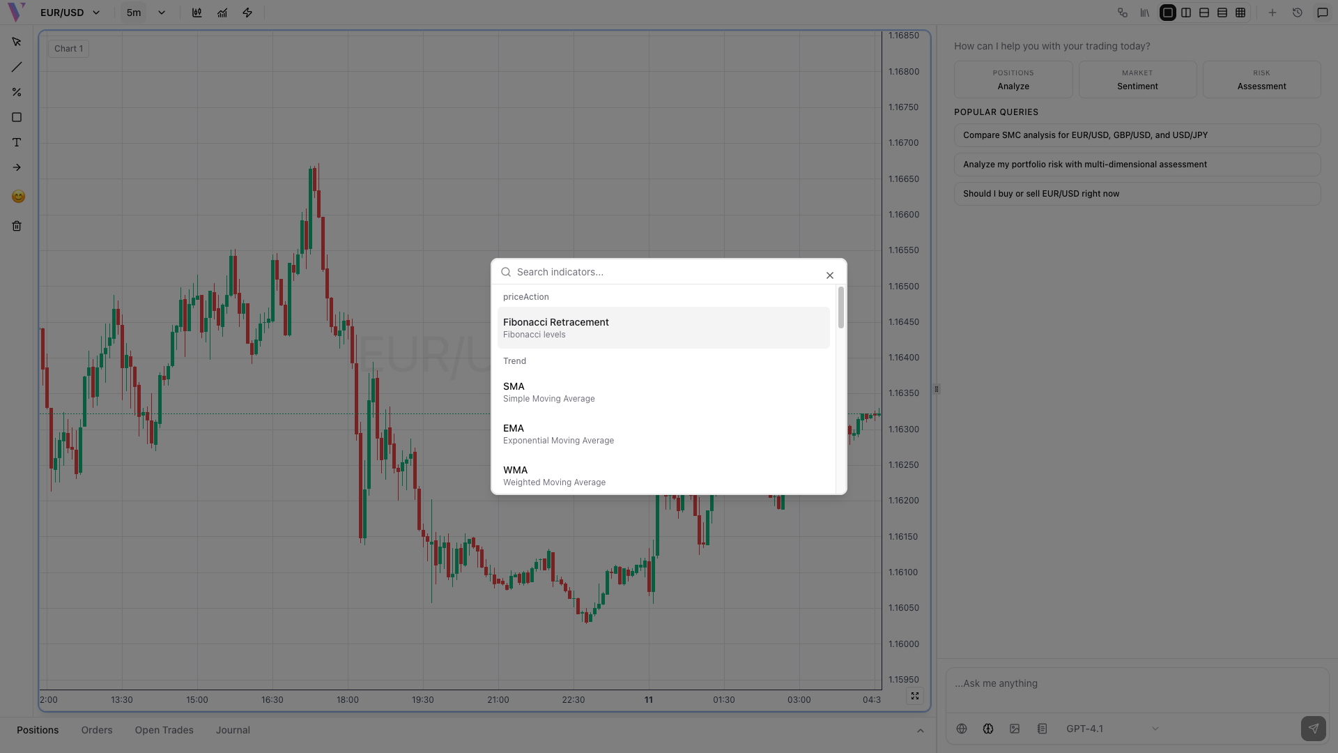 Click the indicators button in the toolbar to open the comprehensive indicator selection panel with categories for different trading strategies.